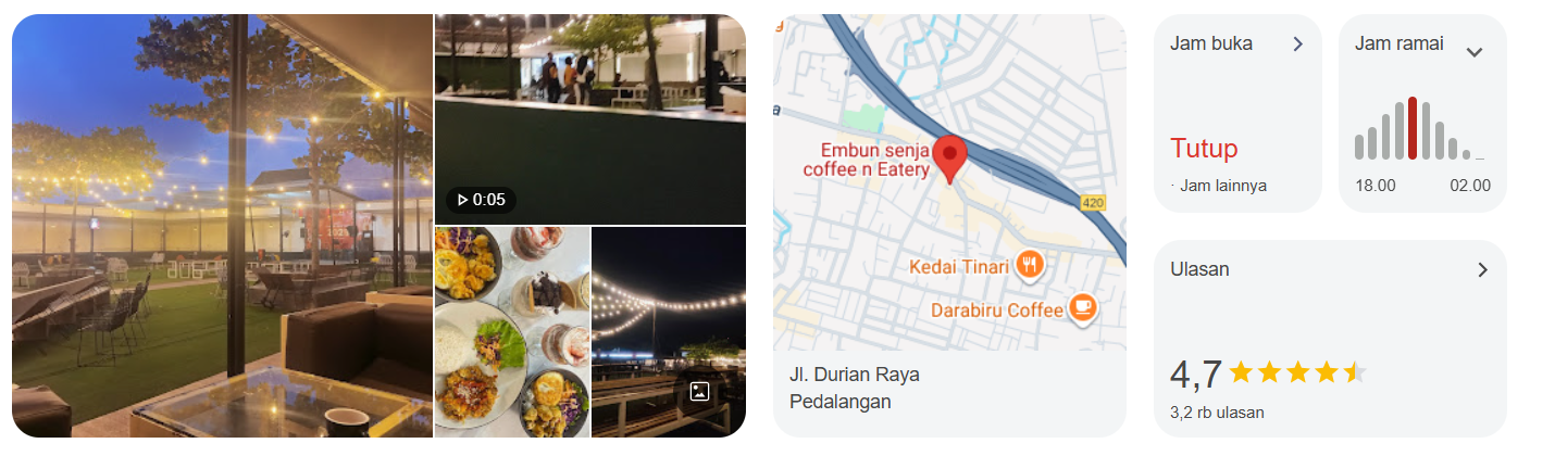 Embun Senja adalah pilihan tepat kalau kamu ingin bukber yang nggak sekadar makan, tapi juga ada entertainmentnya. Kafe ini menyediakan area outdoor dengan live music yang membuat suasana buka puasa makin meriah. Dengan lebih dari 3.200 ulasan dan rating 4.7, popularitasnya memang nggak perlu diragukan.