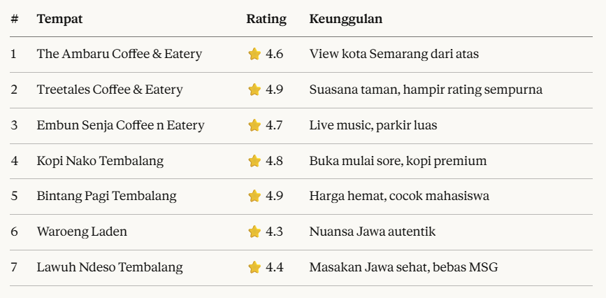 Yang terpenting, pilih tempat yang sesuai dengan karakter kelompokmu. Apakah kalian tim yang suka foto-foto estetik? Tim yang lebih suka ngobrol santai? Atau tim yang mengutamakan cita rasa autentik masakan Jawa? Semua ada di Tembalang!